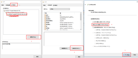 注意:这个要看证书的阶级,如果是四级证书 ,如上的话就要一级级把证书导出来。如三级证书,只需要将顶级根证书导出与issuer.crt证书准备好为后续的导入即可。